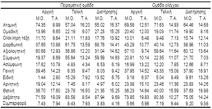Στον Πίνακα 1 φαίνονται οι μέσοι όροι και οι τυπικές αποκλίσεις των δύο ομάδων