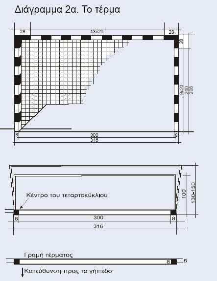 την οποία περιβάλλουν. Η γραμμή τέρματος έχει πλάτος οκτώ εκατοστά μεταξύ των δοκαριών (διάγραμμα 2α), αντίθετα όλες οι άλλες γραμμές έχουν πλάτος πέντε εκατοστά